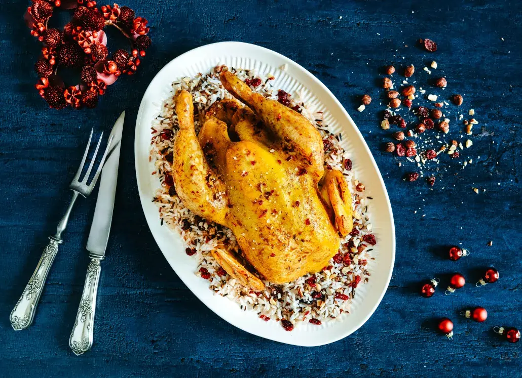 Une poularde généreuse farcie de riz, noisettes croquantes et cranberries acidulées.