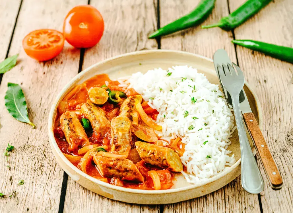 - Éplucher et émincer finement l’oignon. Éplucher l’ail et le gingembre. Couper les tomates en dés. Couper les saucisses en biseaux d’environ 4 cm.