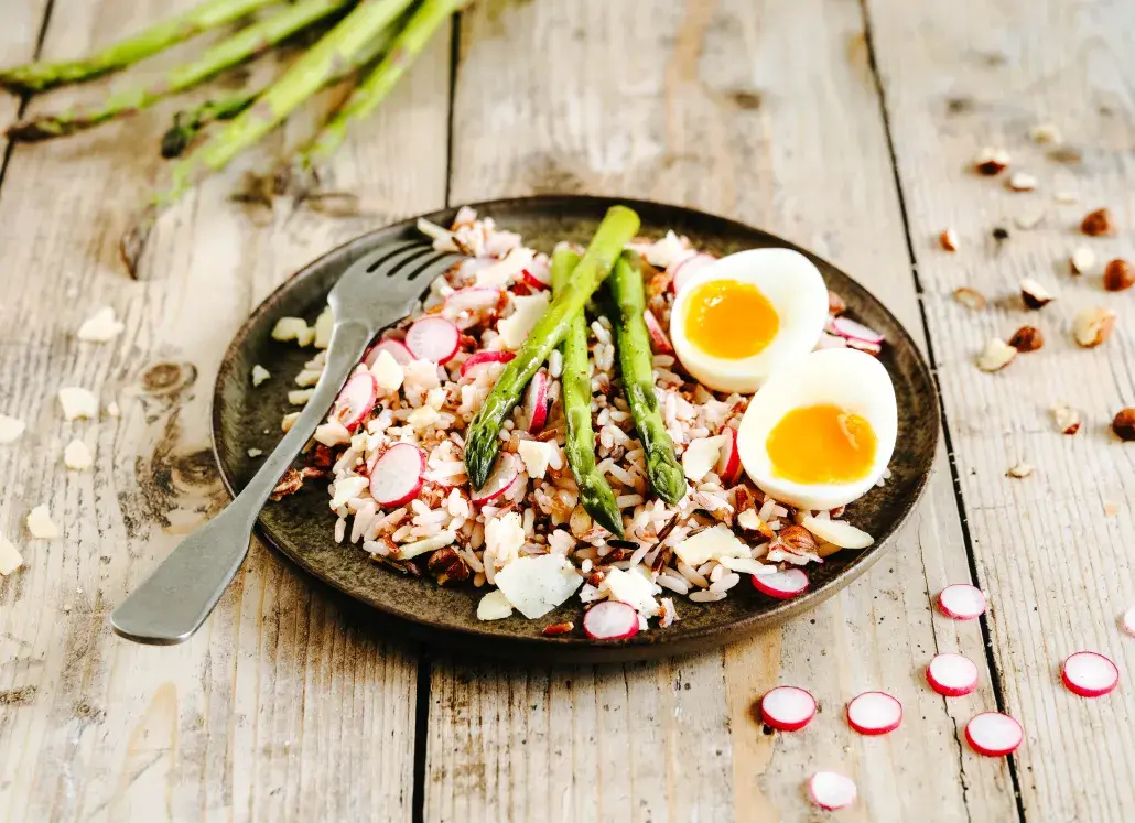 - Dans une petite assiette creuse, disposer le riz, les asperges et l'œuf mollet délicatement. Saupoudrer de noisettes et de copeaux de parmesan puis verser la vinaigrette au moment de la dégustation.