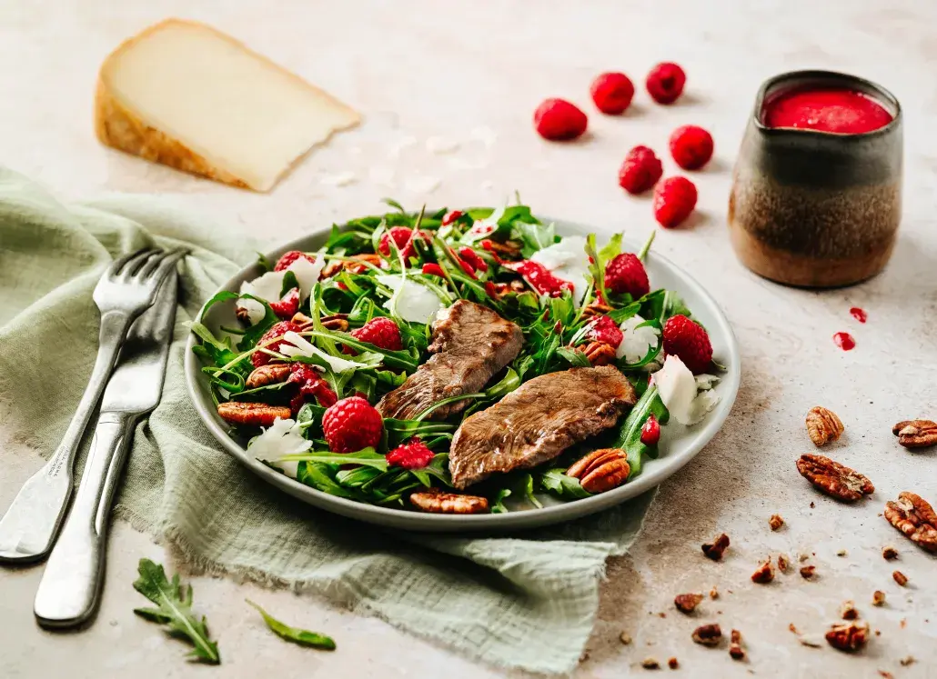 L’alliance parfaite du canard, de la roquette, la noix de pécan et les framboises pour une salade unique.