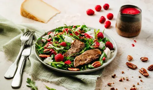 Salade d’aiguillettes de canard, roquette, noix de pécan et framboises