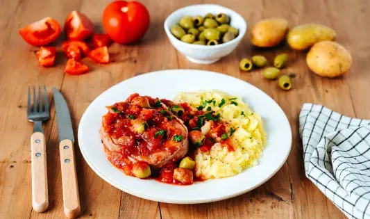 Osso buco de dinde aux tomates et aux olives, écrasé de pommes de terre