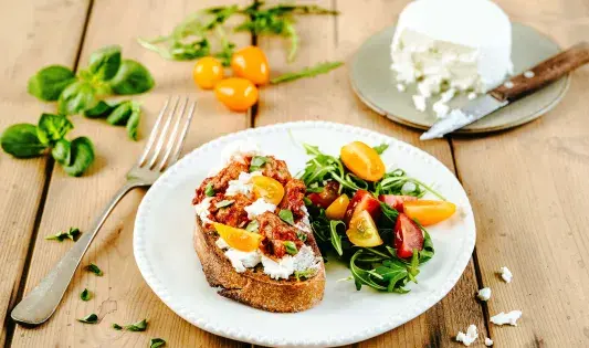 Bruschetta au sauté de porc, fromage frais de brebis et tomates cerise