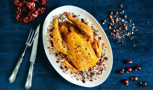 Poularde farcie au riz sauvage, noisettes et cranberries