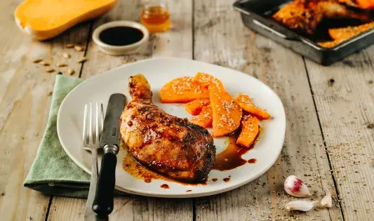 Cuisses de poulet caramélisées et courge butternut rôtie au four