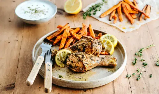 Pilons de poulet grillés au citron et aux herbes de Provence, frites de patates douces