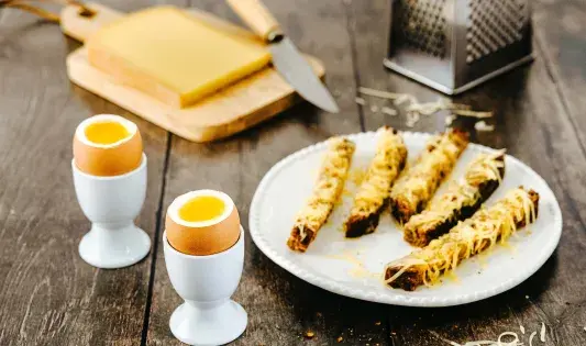 Œuf à la coque et mouillettes gratinées au comté