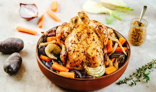 Poulet à la moutarde et légumes rôtis au four